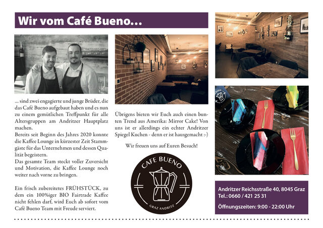 Wenn Sie auf der Suche nach einem gemütlichen Kaffeehaus für den entspannten Sonntagnachmittag sind, dann statten Sie uns doch mal einen Besuch ab. Treten Sie ein und machen Sie es sich in unserem urgemütlichen Kaffeehaus bequem. So lässt sich das Wochenende verbringen! Egal ob mit Freunden, Familie oder nur zum Lesen – fühlen Sie sich bei uns im Cafe Bueno herzlich willkommen! Absolute Entspannung bietet in der warmen Jahreszeit unser einzigartiger Außenbereich.